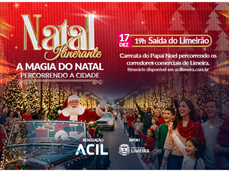A ACIL realizará, no dia 17 de dezembro, com o apoio da Prefeitura de Limeira, a primeira edição da Carreata de Natal ACIL Itinerante, uma ação que promete transformar Limeira em um grande cenário iluminado e festivo. A concentração será no Limeirão a partir das 18h30, com saída marcada para as 19h. A proposta é levar encanto, música e o clima natalino para diversos corredores comerciais da cidade, unindo empresas, comerciantes e a população em um momento de celebração.
