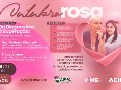 O Conselho da Mulher Empreendedora (CME), da ACIL (Associação Comercial e Industrial de Limeira) em parceria com a ALICC (Associação Limeirense de Cuidado e Carinho), promove no próximo dia 1º de outubro, às 19h, na sede da ACIL, a tradicional Abertura do Outubro Rosa.